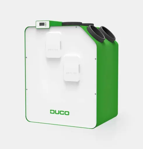 De DucoBox Energy Premium is tevens beschikbaar in een linkervariant (= schuine zijde links) en rechtervariant (= schuine zijde rechts). Op de schuine zijde wordt een toe- en afvoerkanaal naar de woning aangesloten (ETA en SUP).