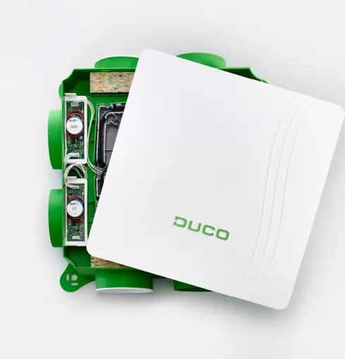 De DucoBox Focus zorgt dankzij de gepatenteerde interne regelkleppen voor een zonale afvoer van vervuilde en/of vochtige lucht. De afzuigventilator is zowel de motor van het systeem, als de master unit waarop sturingscomponenten kunnen worden aangemeld. Dankzij intelligente metingen op basis van CO2- en/of vocht wordt er enkel geventileerd waar en wanneer nodig én in de juiste hoeveelheid!