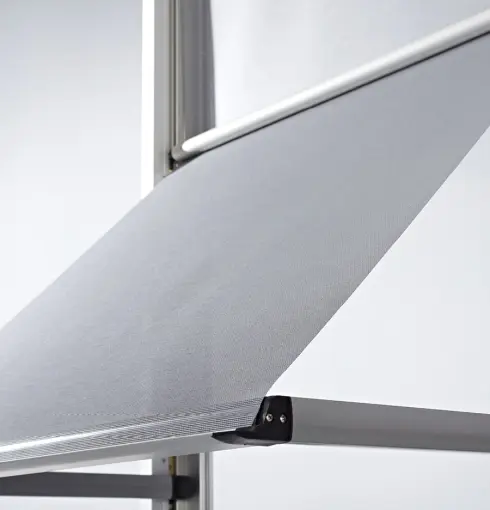 Het zonweringdoek is bij deze uitvoering gemonteerd op een uitvalarm, die eerst verticaal naar beneden zakt, maar daarna automatisch uitvalt in een hoek van maximum 90°. Op die manier krijgt zonnehitte geen kans, maar komt er toch genoeg licht binnen voor een aangenaam gevoel binnenshuis.